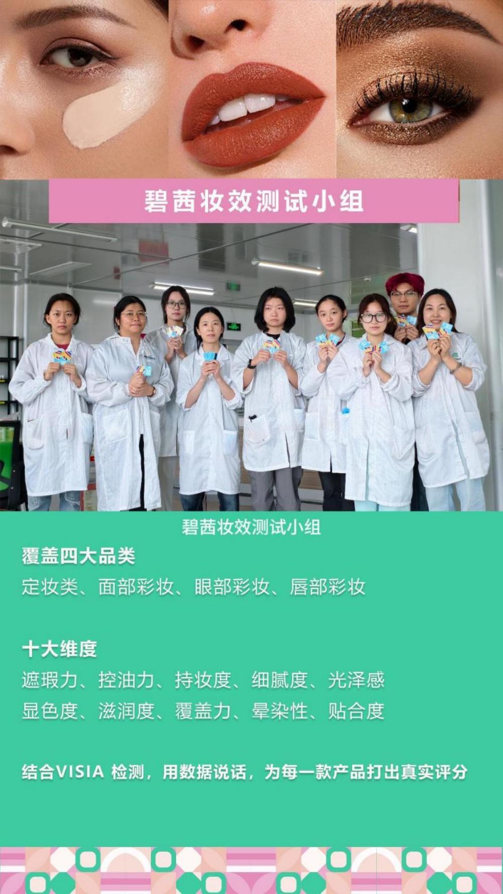 Makyaj efekti ekibi şunlara odaklanır: kapatıcı, yağ kontrolü, kalıcı, narin, parlak, renk oluşturma, nemlendirme, örtme, lekelenme ve takma. Dört ana makyaj kategorisi de dahil olmak üzere on boyut çekirdektir. Sıvı temelin kusur gizleyici gücü, set makyajının yağ kontrolü ve makyaj tutma etkisi veya göz farı rujunun renk inceliği olsun, burada profesyonel "altın göz" den kaçamaz.